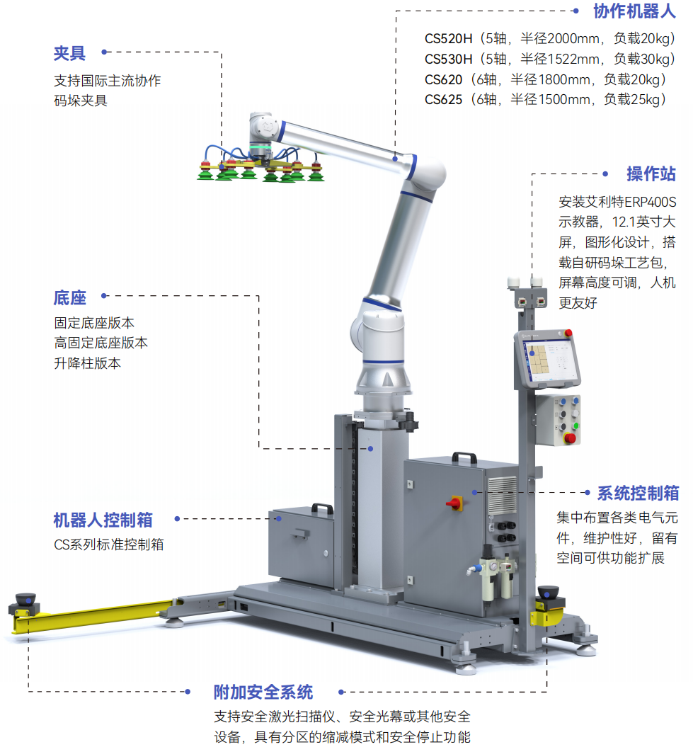 深入洞察這一底層痛點,艾利特將協作機器人的靈巧作業能力與智能升降技術深度融合,推出的CP系列模塊化協作碼垛工作站,打破了傳統自動化設備在空間與功能上的剛性約束,以“高柔性、高效率、快部署”三大突破,重新定義碼垛自動化范式。