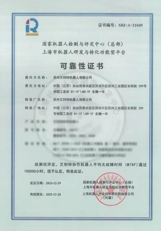 業(yè)內(nèi)首家!艾利特機(jī)器人通過(guò)MTBF 10萬(wàn)小時(shí)認(rèn)證,協(xié)作機(jī)器人可靠性攀頂新臺(tái)階!