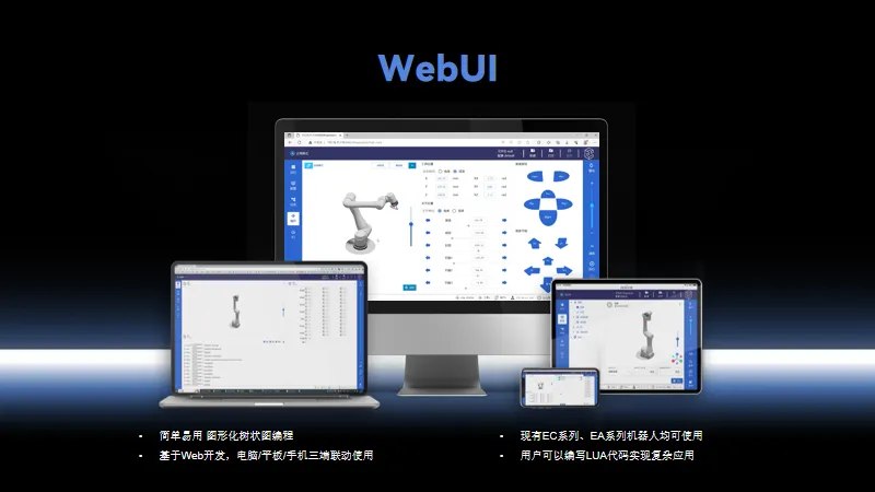 除了硬核的產(chǎn)品與技術(shù),艾利特在軟件生態(tài)方面依然是創(chuàng)新破局者。在2023年,艾利特全新推出了基于瀏覽器的WebUI示教軟件,可以在手機(jī)、平板、電腦跨設(shè)備協(xié)同操作,艾利特EC系列、EA系列均可適用,給協(xié)作機(jī)器人示教帶來(lái)新的玩法。