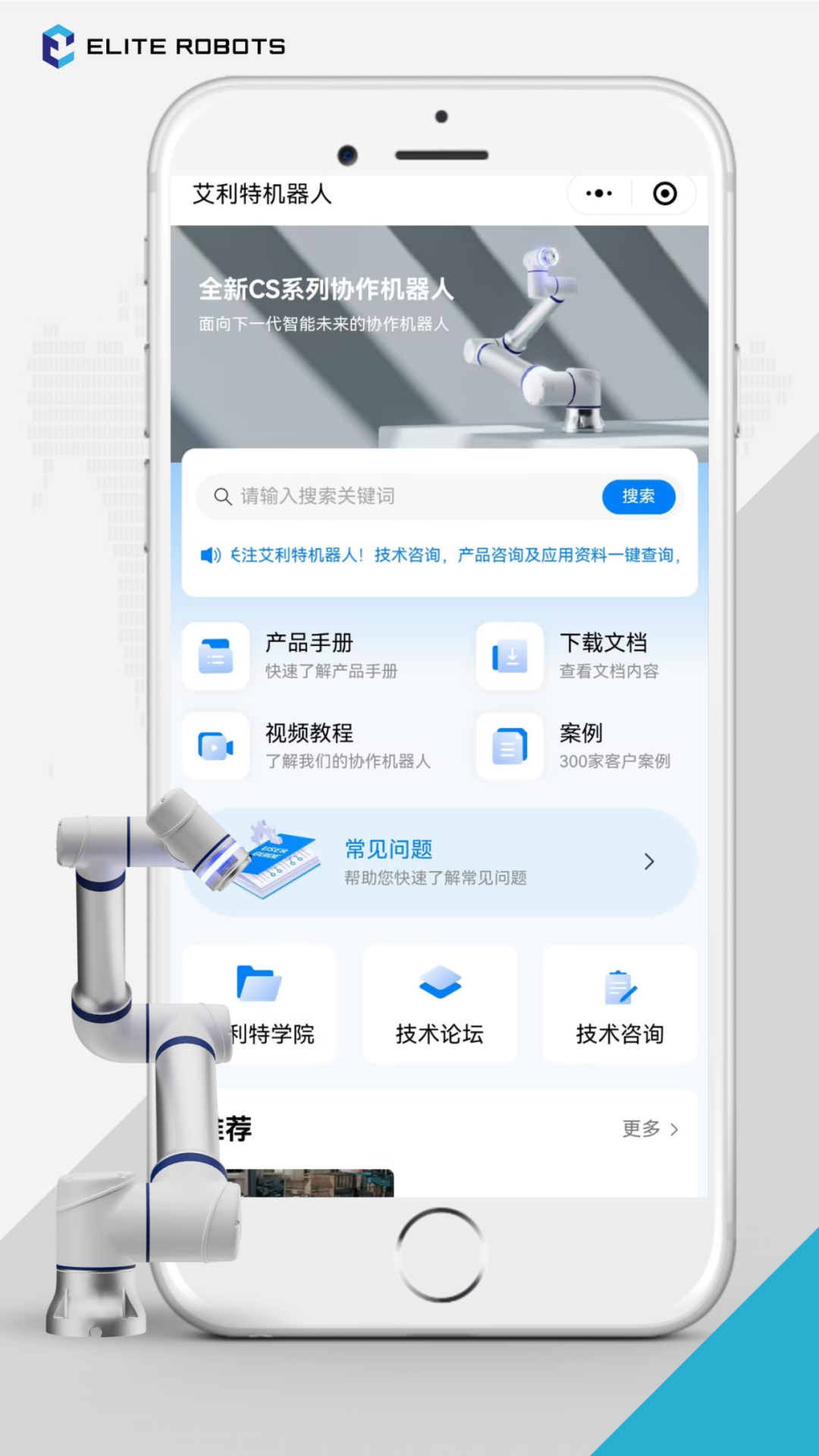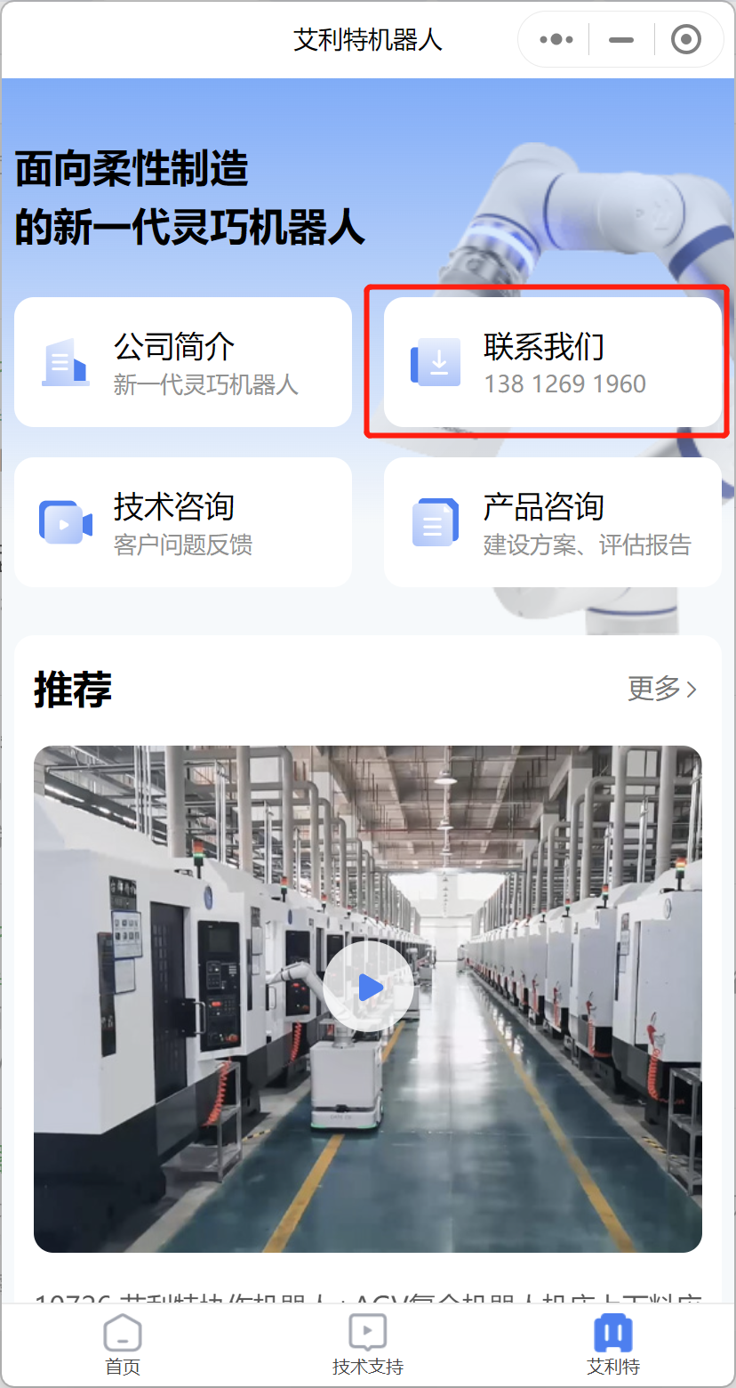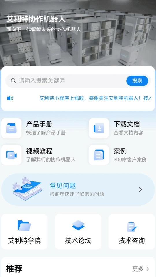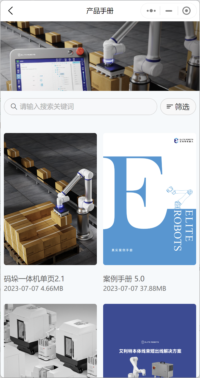 優化升級的“艾利特機器人”小程序,首頁匯聚了產品手冊、下載文檔、視頻教程、案例等專區板塊,重點信息一目了然。