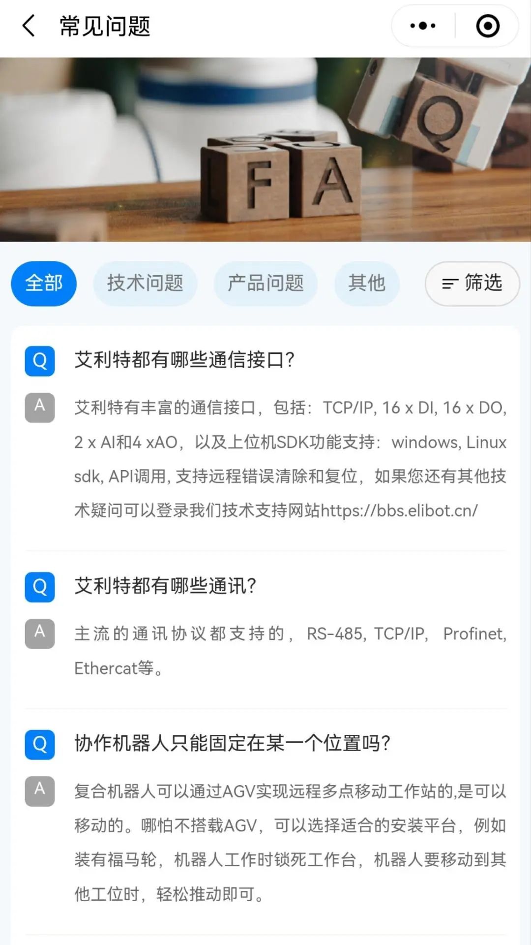 為幫助用戶更直觀了解艾利特協作機器人的操作注意事項及常見問題解決方法,小程序還設置【常見問題】板塊,讓解決問題快人一步!